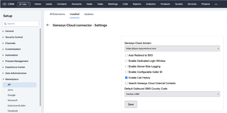 (Alternatively you can navigate to: Zoho CRM Settings -> Marketplace -> All -> Installed -> Genesys Cloud connector -> Settings)